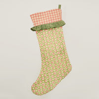 Pre-order - Available for delivery in early November A playful twist on a festive classic. This quilted Christmas stocking is made from soft, organic cotton and hand block-printed in Jaipur using traditional techniques. Featuring a cheerful mustard yellow gingham cuff, a red and pink striped ruffled trim, and delicate star patterned body checks, it’s designed to be cherished year after year. Designed in collaboration with Yonder Living for a unique one-of-a-kind stocking, perfect for both adult and children alike. Ethically crafted and full of character, it’s the perfect heirloom piece for filling with thoughtful gifts and festive treats. Made from 100& organic cotton.